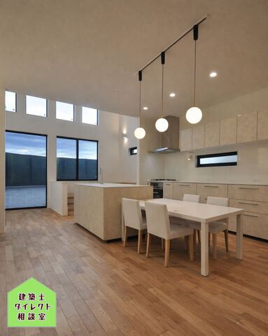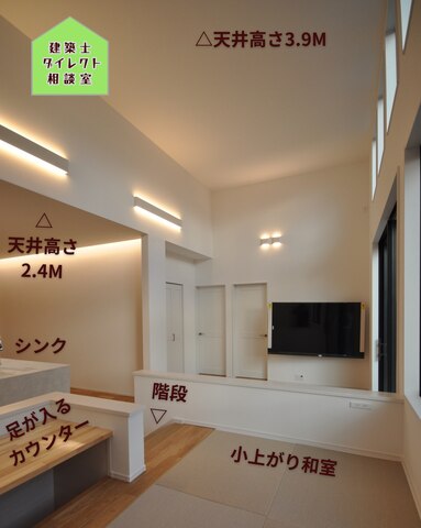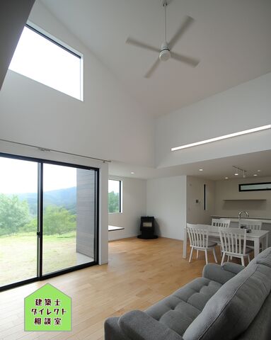 ハイサイドライトの下にLDK(スキップフロア)天井高さ3.9Mの平屋建ての大空間です。