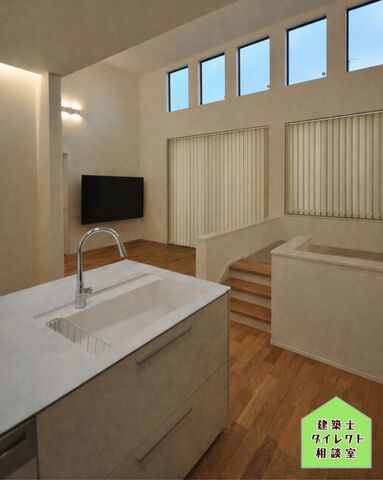 ハイサイドライトの下にLDK(スキップフロア)天井高さ3.9Mの平屋建ての大空間が奥に見えます。シンクとダイニング部分は通常の天井高さです。