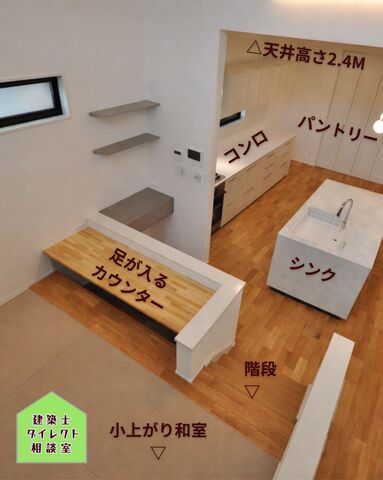 写真左がキッチン。右が中二階のスタディースペース。家事をしながら、お子様の宿題を見れます。